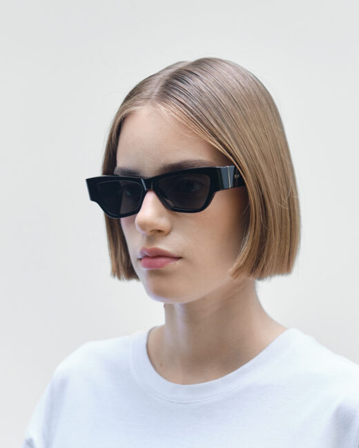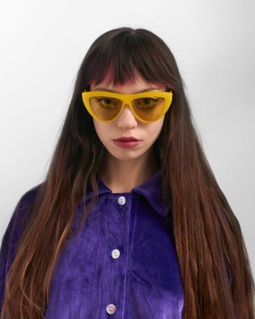 Оправа Razzo (від італ. “ракета”) має низькопрофільний дизайн рамки, який поєднує естетику спортивного стилю та Y2K-аксесуарів. Динамічну форму підкреслюють термоформовані ацетатні дужки. У цій версії Razzo використано незвичайний металевий ацетат кольору шавлії, доповнений яскравими фіолетовими лінзами.