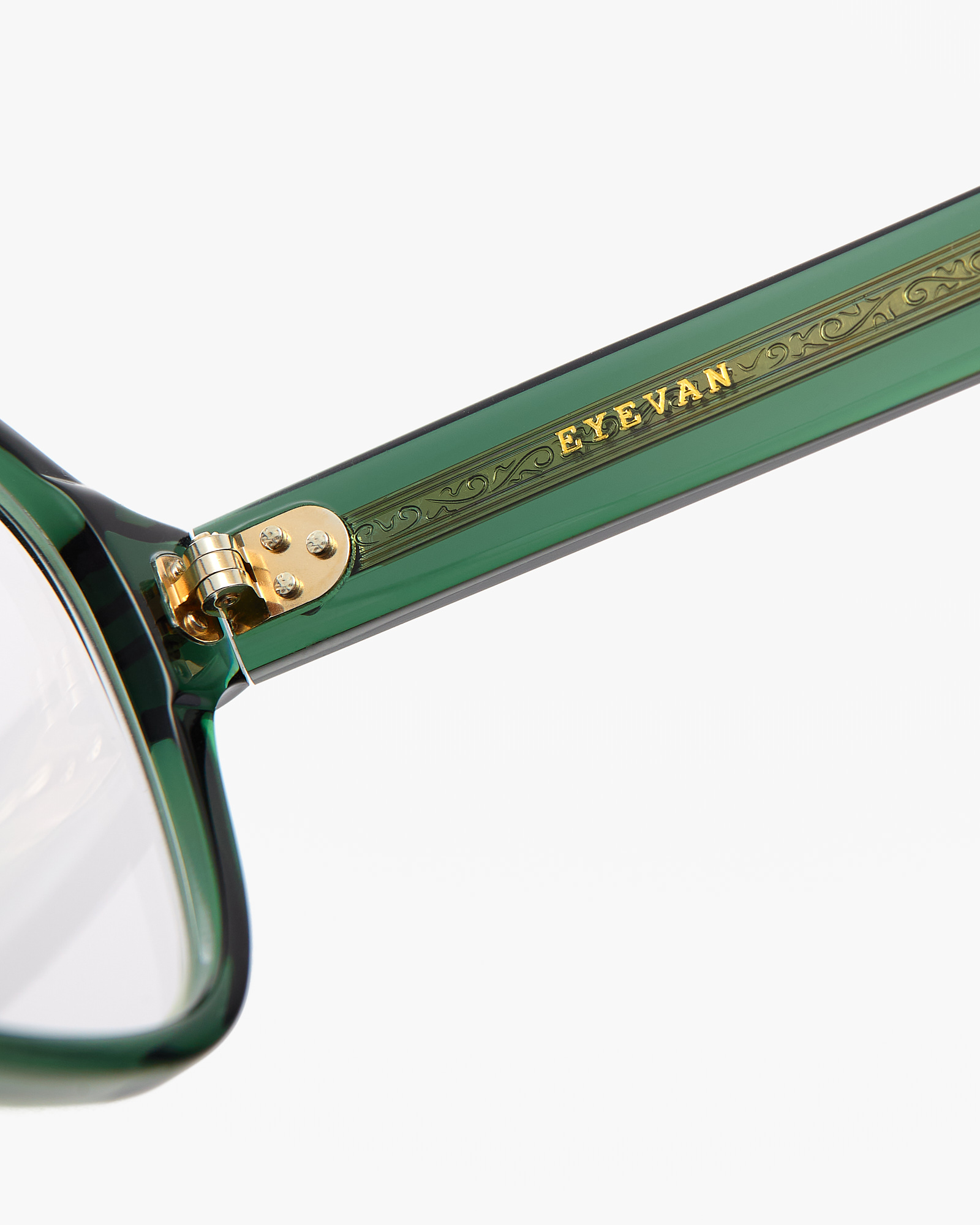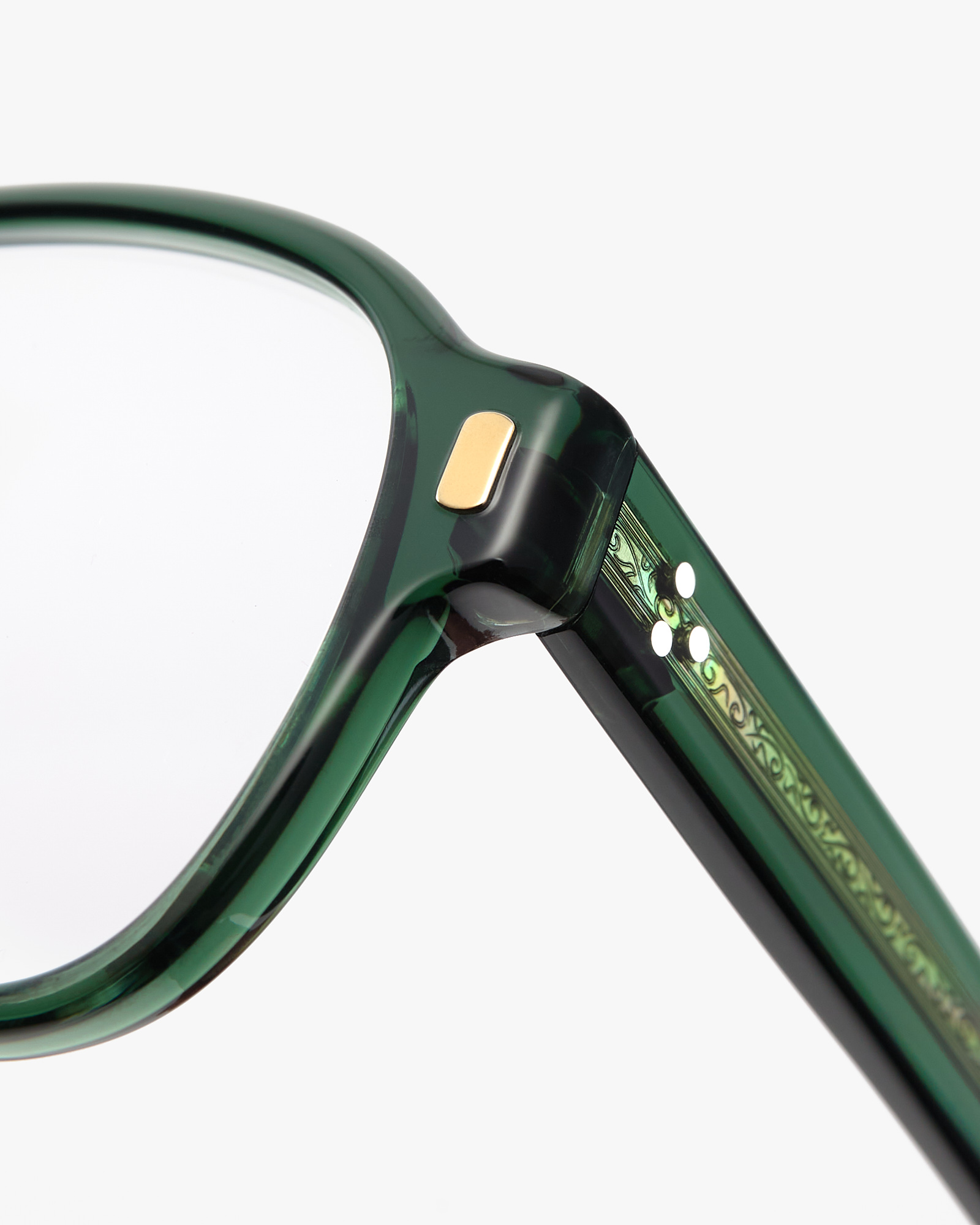 • A metal rod with ornamental embossing is barely visible through the acetate of the temples.