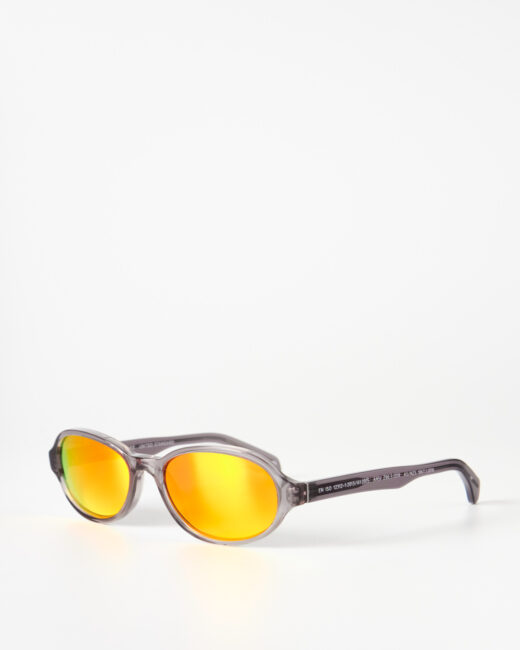 Квадратная оправа с классическими элементами: двухточечными заклепками на торцах и дужках и переносицей в стиле key hole. В меру массивная рамка из полупрозрачного серого ацетата. Заушники декорированы металлическими наконечниками. Оправа была впервые предоставлена в коллекции f/w 2019.