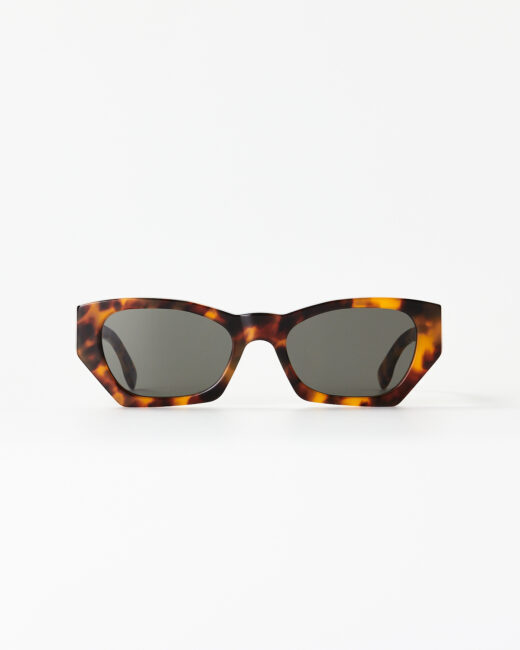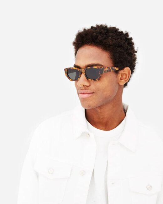 Окуляри в напівпрозорій ацетатній оправі динного кольору зі світло-жовтими лінзами. Масивний гібридний силует.