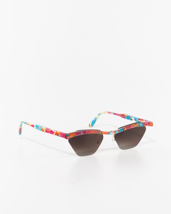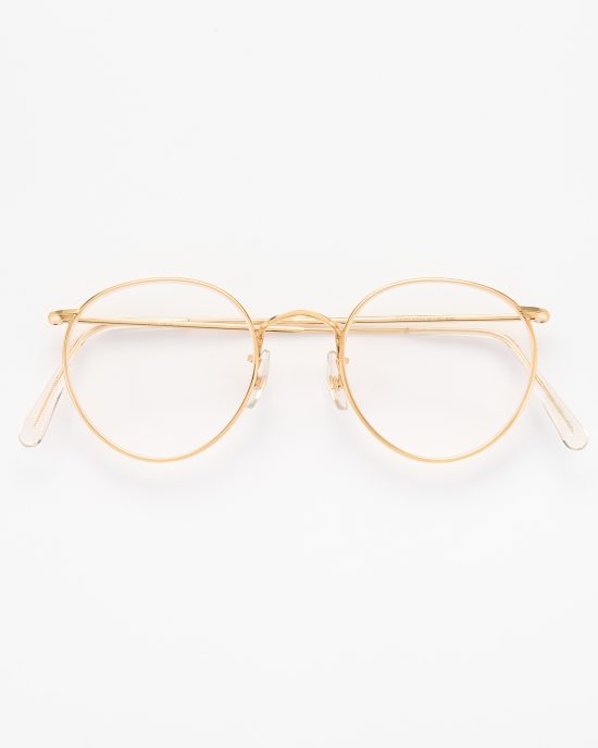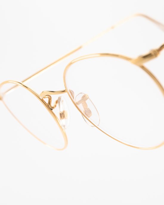 Узкая винтажная оправа из золотого металла и полупрозрачного ацетата. Изогнутая вытянутая форма. Сделана в Италии.