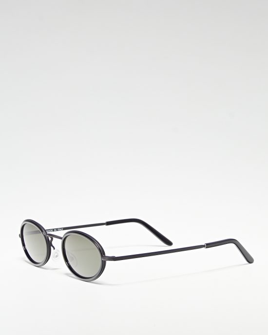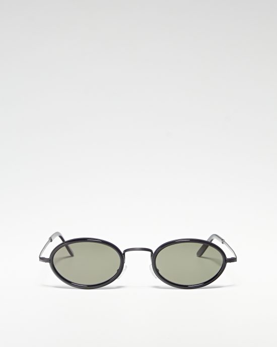 Очки в массивной ацетатной оправе. В прямоугольную форму оправы вписаны овальные окуляры с коричневой линзой.